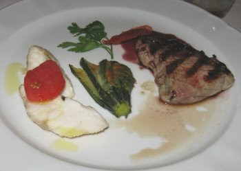 Beef with cannonau and shallot reduction, Monkfish with candies tomato and olive oil.